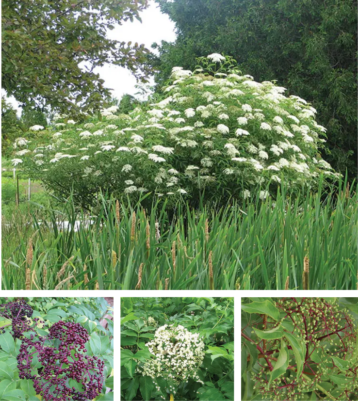 American Elderberry is a large shrub with bright green leaves, white clusters of fragrant flowers, and black fruits that are edible when cooked. Elderberry blooms at times of year when little else is flowering. This species can tolerate low, wet areas. It’s perfect for those wanting wildlife-friendly features. Must be pruned in the late winter.